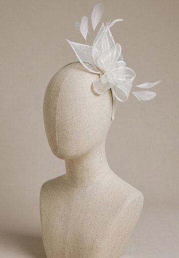 Un magnifique fascinator de mariage blanc cassé à plumes et sinamay.